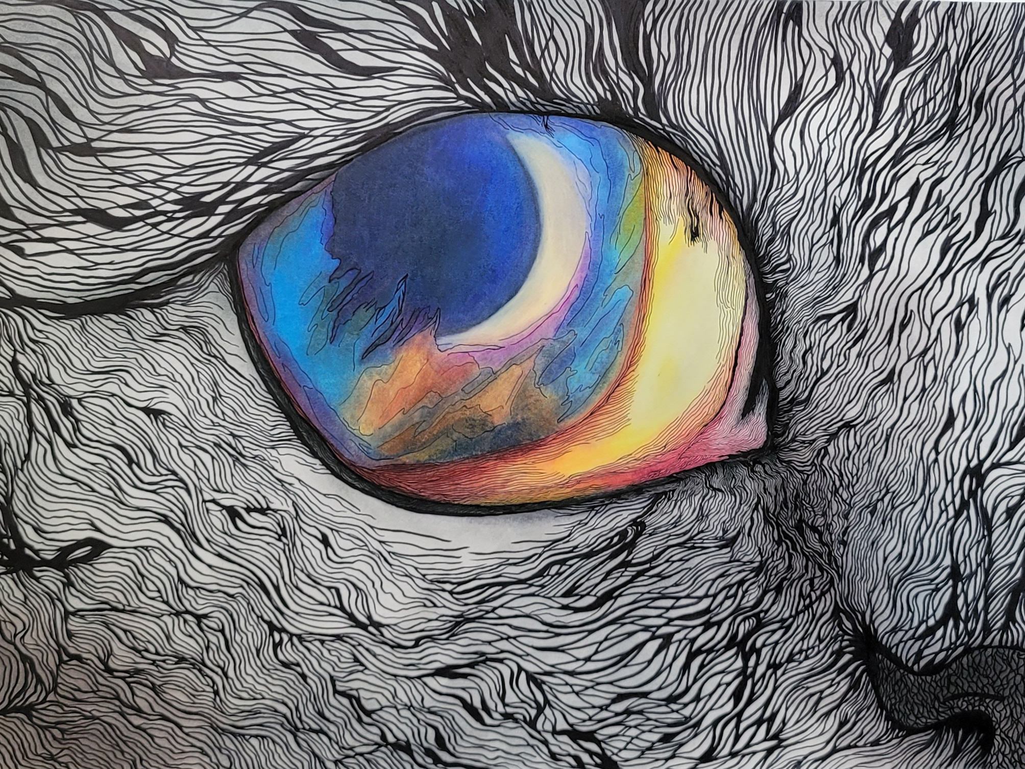 This art series explores the mystical and surreal connection between the animal kingdom and the celestial realm. Each piece centers on a single eye, representing the gateway between earthly creatures and the cosmos. With swirling lines and rich color palettes, the intricate fur patterns dissolve into the dream-like, moonlit reflections in the eyes. The vivid hues and flowing shapes evoke the profound yet primal connection that binds the spiritual and natural worlds. Through these hypnotic, otherworldly gazes, we are reminded that nature is both watchful and intertwined with the universe, quietly holding the mysteries of existence.